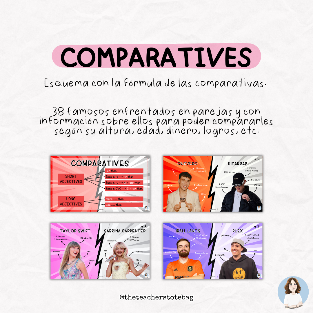 En la parte de las comparativas, se incluye un esquema recordatorio de cómo formar comparaciones. A continuación, se muestra un total de 38 famosos españoles y anglosajones, conocidos por los estudiantes, con información sobre ellos para poder compararles según su altura, edad, dinero, logros, etc.