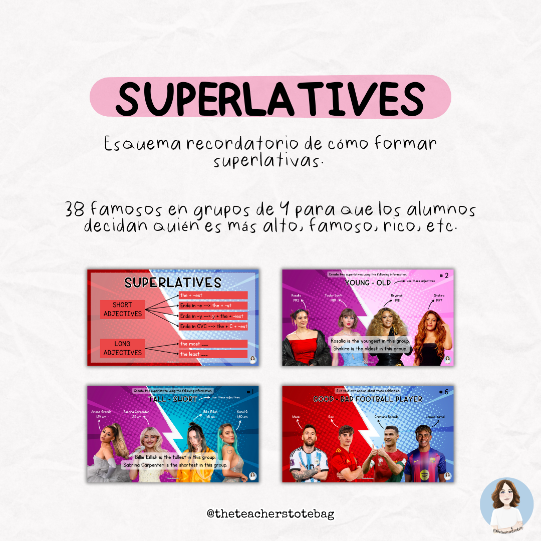 En la parte de las superlativas, se incluye un esquema recordatorio de cómo formar superlativas. A continuación, dichos 38 famosos se juntan en grupos de 4 para que los estudiantes decidan quién es más alto, famoso, rico, etc.